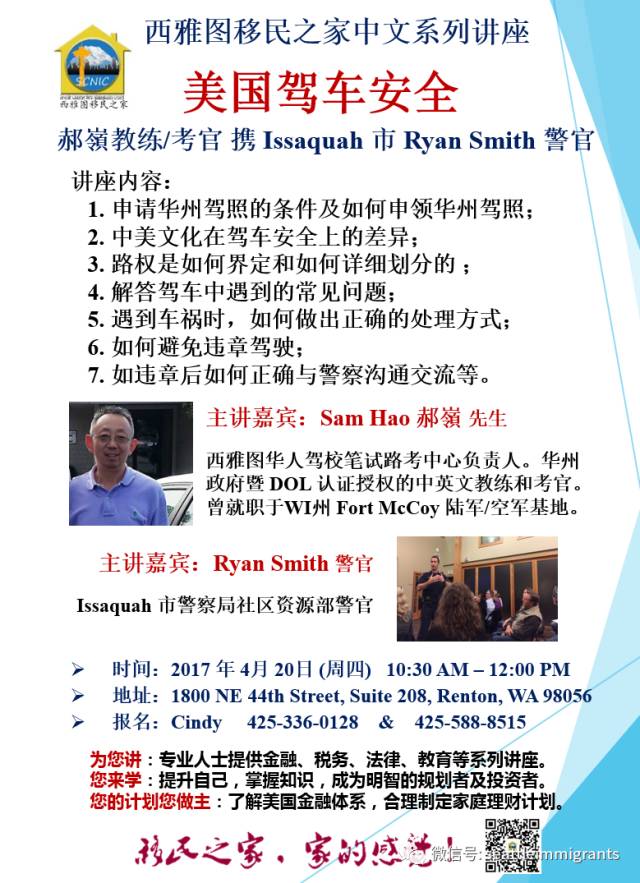 应广大移民之家会员的要求:4月20日,西雅图移民之家友情特邀:西雅图华人驾校笔试路考中心负责人 郝嶺先生 和Issaquah 市警察局社区资源部 Ryan Smith警官 来分享 “美国驾车安全”的注意事项并解答大家的问题。